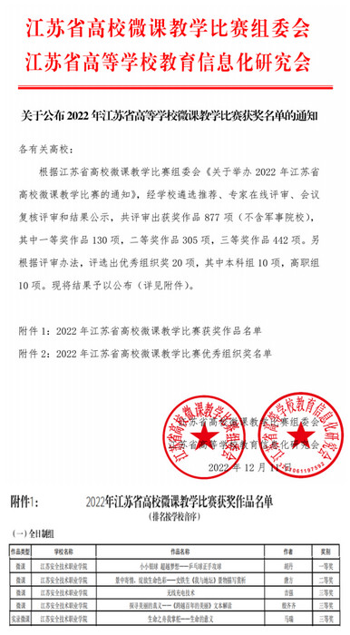 近日,江蘇省高校微課教學比賽組委會公布了2022年江蘇省高校微課教學比賽獲獎名單。我院報送作品榮獲一等獎1項,二等獎1項,三等獎3項。
