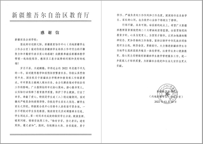 辭舊迎新之際,新疆維吾爾自治區(qū)教育協(xié)作中心向我院發(fā)來感謝信,向我院在新疆班學(xué)生培養(yǎng)工作中付出的不懈努力和辛勤勞作表示感謝。