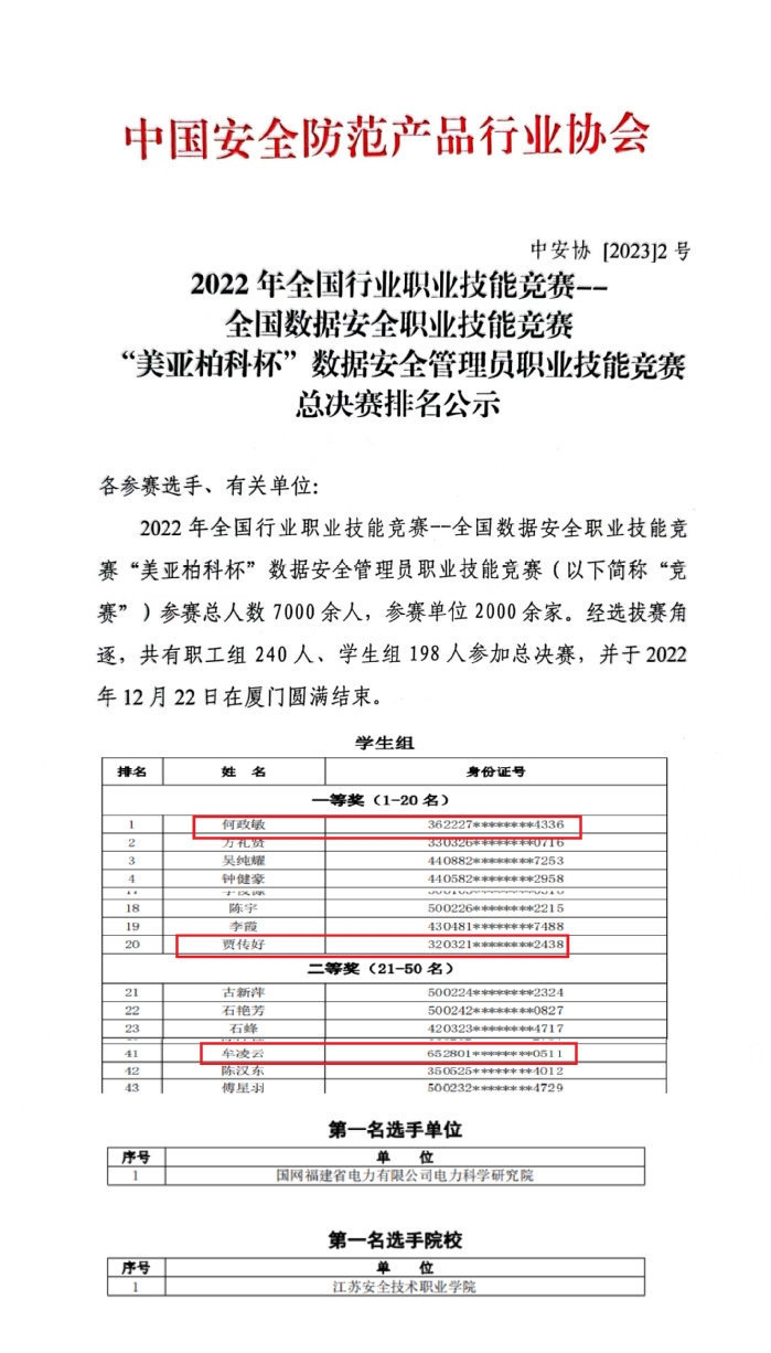 近日,中國安全防范產品行業協會發布文件,公示2022年全國行業職業技能競賽——全國數據安全職業技能競賽“美亞柏科杯”數據安全管理員職業技能競賽總決賽排名,在網絡與信息安全學院石春宏老師的指導下,何政敏、賈傳好同學榮獲學生組一等獎,其中何政敏同學獲得第一名。牟凌云同學榮獲學生組二等獎。學院獲評“優勝院校”。