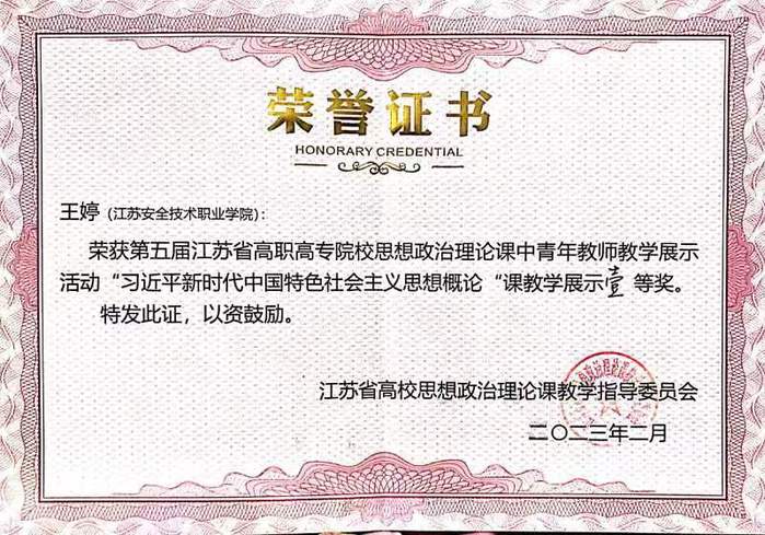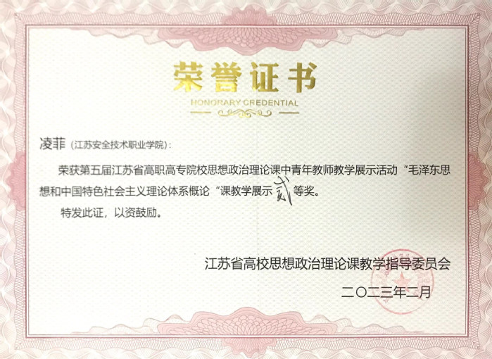 本屆教學展示由江蘇省高校思想政治理論課教學指導委員會主辦,面向江蘇省高職高專院校思想政治理論課教師,分為初賽和決賽兩個階段。我院三位思政課教師憑借扎實的功底和新穎的設計,贏得評委專家的一致好評。本次榮譽的取得是我院在該項目的新突破,標志著我院思政課教師隊伍內涵建設取得新成果。