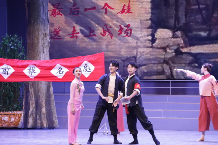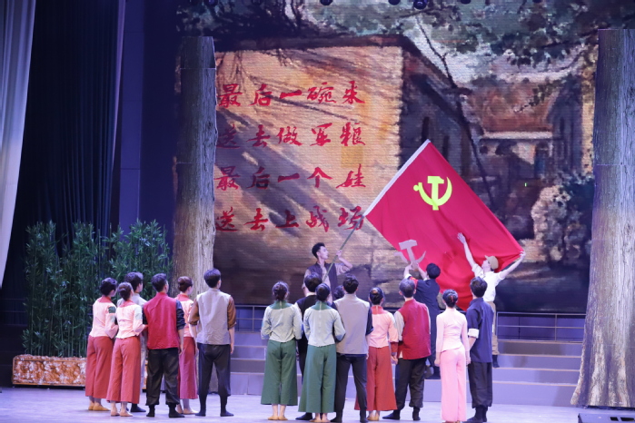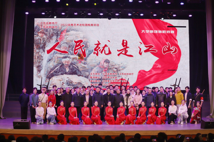 舞蹈詩劇《人民就是江山》是由江蘇師范大學音樂學院傾力打造,講述淮海兒女在中國共產黨領導下拼搏奮斗、義無反顧支援前線的歷史史詩,謳歌中華兒女為祖國解放不怕犧牲、前赴后繼的偉大精神。演員們的精彩表演,加之燈光電設備的完美配合,真實地再現了75年前淮海兒女克服艱難險阻、浩浩蕩蕩英勇支前的歷史畫面;跌宕起伏的劇情,時刻牽動著現場觀眾的心弦,讓觀眾仿佛也置身其中。