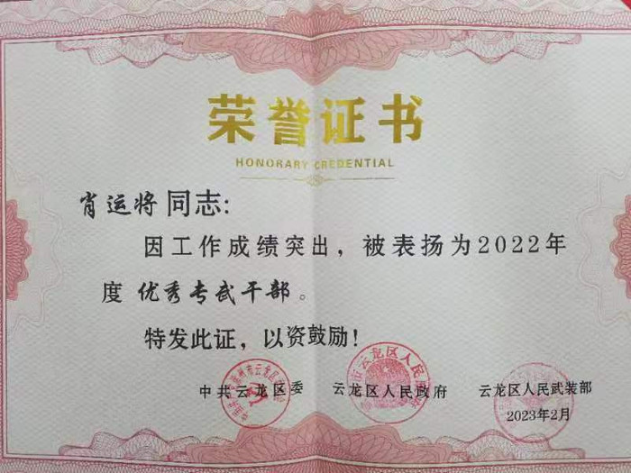 2月22日上午,云龍區(qū)征兵工作總結(jié)部署表彰工作會召開,我院武裝部獲評“先進(jìn)基層武裝部”,我院征兵工作站獲評“征兵工作先進(jìn)單位”。我院肖運(yùn)將同志獲評2022年度“優(yōu)秀專武干部”。