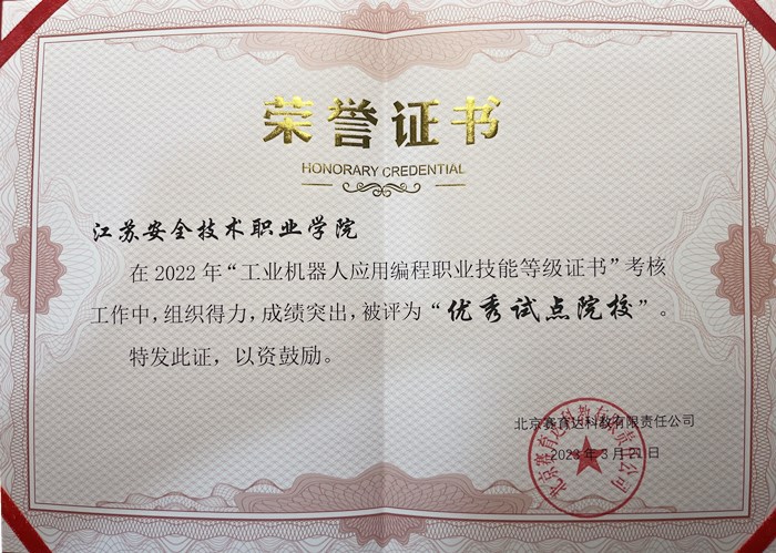 近日,教育主管部門指定的“工業機器人應用編程職業技能等級證書”評價組織北京賽育達科教有限公司,對2022年“1+X”證書試點工作進行總結。我院在2022年“工業機器人應用編程職業技能等級證書”考核工作中,組織得力,成績突出,被評為“優秀試點院校”。