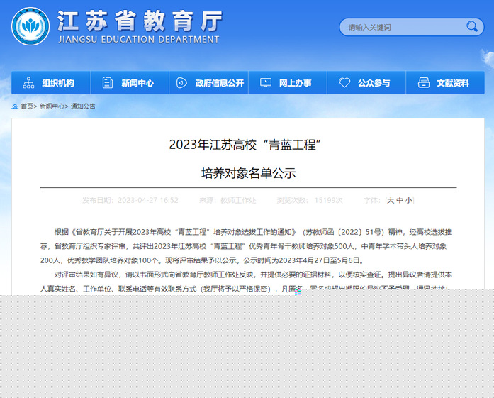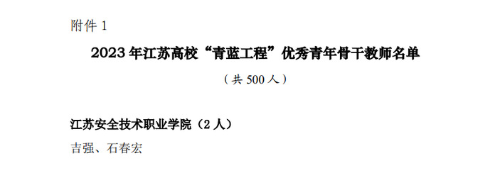 近日,省教育廳公布了2023年度江蘇省“青藍工程”培養對象。我院吉強老師、石春宏老師入選“青藍工程”優秀青年骨干教師培養對象。