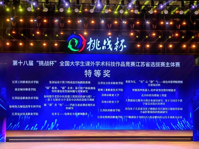 5月26日至28日,第十八屆“挑戰杯”全國大學生課外學術科技作品競賽江蘇省選拔賽決賽在常州大學舉行。經過網絡評審、現場答辯等環節,我院作品獲特等獎2項,首次捧得“優勝杯”。成績位居本次大賽全省高職院校前列,創造了學院在該項賽事省賽中的歷史最好成績。