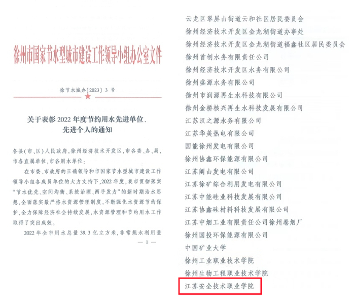 近日,徐州市2022年度“節約用水先進單位”公布,我院被徐州市國家節水型城市建設工作領導小組授予“節水先進單位”榮譽稱號。