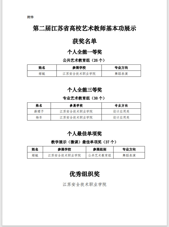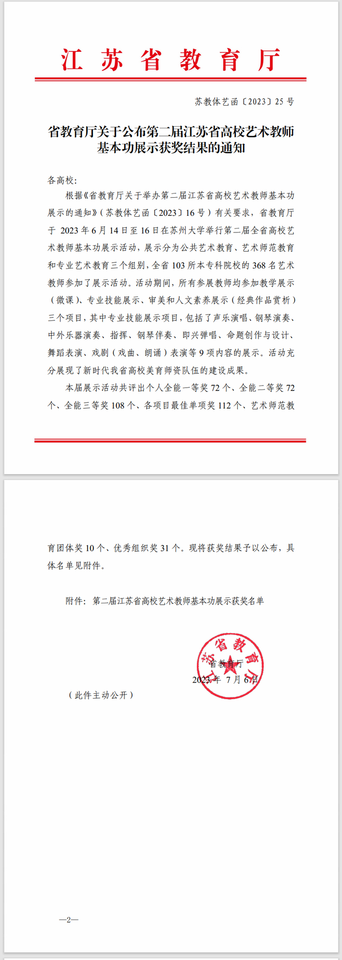 近日,省教育廳公布了《關于公布第二屆江蘇省高校藝術教師基本功展示獲獎結果的通知》(蘇教體藝函〔2023〕25 號)。商貿與人文學院姬毓老師榮獲公共藝術教育組個人全能一等獎\教學展示(微課)最佳單項獎,薛珺予老師榮獲專業藝術教育組個人全能三等獎,楊岑老師榮獲專業藝術教育組個人全能三等獎,學院榮獲“優秀組織獎”。