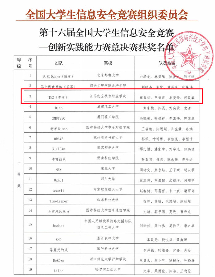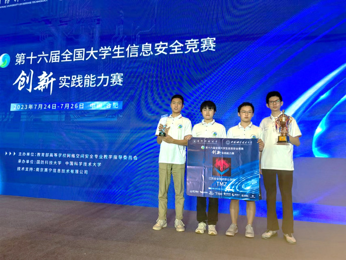 在7月23日至25日舉行的第十六屆全國大學生信息安全競賽上,我院何政敏、崔智銘、牟凌云、王智哲四名同學組成的“TMZ”戰隊,以“工控安全”單項第一,總分全國第三的成績奪得季軍寶座,榮獲一等獎。本次比賽,來自全國486所高校的1323支戰隊6037名選手,歷經三個月賽程,經歷了線上賽和分區賽的層層選拔,共80支隊伍進入總決賽。在經過了7月3日至19日的線上網絡測繪系統開發,以及7月24日至25日兩天的線下工控系統安全、量子安全、人工智能安全、攻防對抗等環節,經過激烈比拼,“TMZ”戰隊最終收獲好成績。