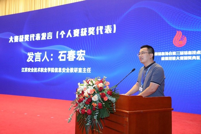 在8月26日至27日舉行的第四屆信息技術及應用創新人才發展交流大會暨中國信息協會第三屆信息技術服務業應用技能大賽頒獎典禮上,我院教師石春宏在網絡與信息安全技術及應用賽項(職工組)上喜獲第一名,并代表獲獎選手上臺發言。