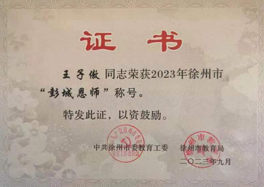 近日,中共徐州市委教育工委、徐州市教育局公布了2023年徐州市“彭城恩師”受表揚集體和個人名單,我院王子傲老師榮獲“彭城恩師”稱號。