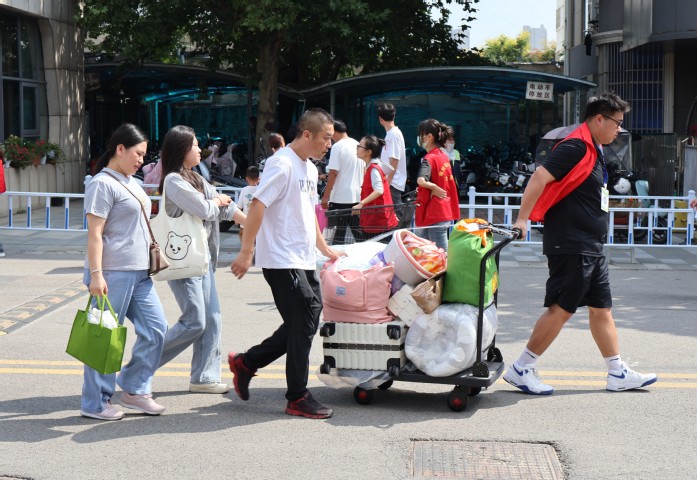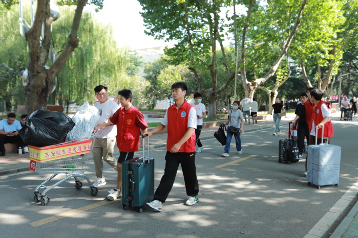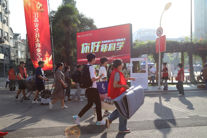 在高鐵站、火車站、汽車總站,學院為2023級新生提供接站服務,迎新接站志愿者們在各個站點等候迎接。校園內,師生志愿者們堅守在自己的崗位上,從校園引導到行李搬運,從問詢服務到介紹學校,無處不在的“紅馬甲”是今日校園里最靚麗的風景線。