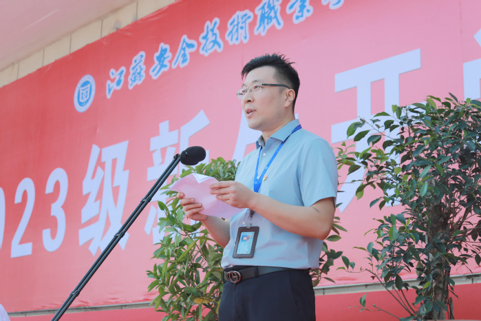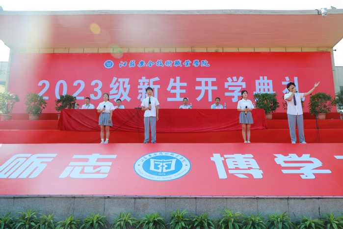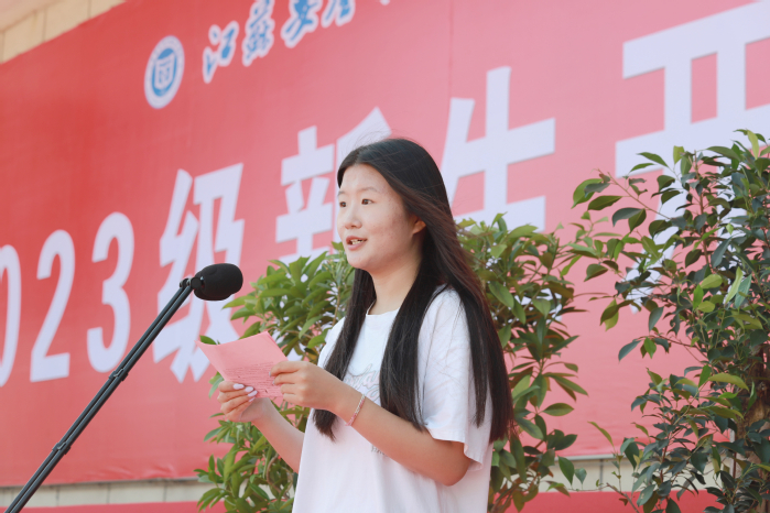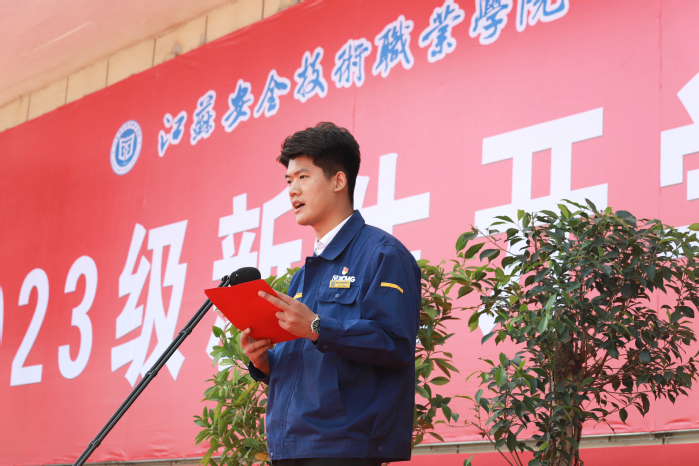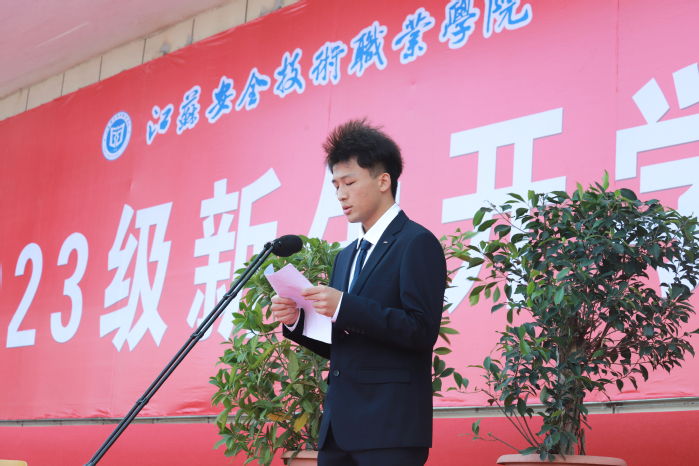 2023級數字媒體技術1班張詩涵同學、安全技術與管理“3+2”分段班新生代表鄭錦民同學作為新生代表先后發言。他們用真摯的語言分享了自己初入大學校園的喜悅,號召全體23級新同學秉承“修德礪志 博學立新”的校訓精神,不忘初心,在匠心筑夢、技能報國的青春賽道上勇往直前。