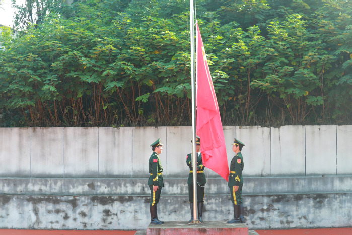 典禮開始前,舞蹈、詩歌朗誦、大合唱《歌唱祖國》點燃了典禮現場的氣氛。隨后,典禮正式開始,國旗護衛隊邁著鏗鏘有力的步伐護送國旗緩緩走來。在全場新生的注目之下,伴隨著雄壯的國歌聲,鮮艷的五星紅旗冉冉升起。