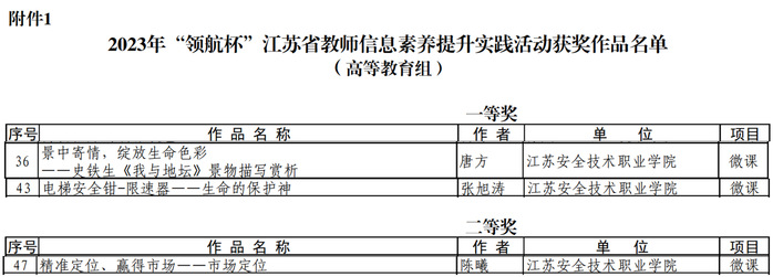 2023年“領(lǐng)航杯”教師信息素養(yǎng)提升實踐活動獲獎名單于近日發(fā)布,我院推薦的《景中寄情,綻放生命色彩 ——史鐵生<我與地壇>景物描寫賞析》(作者:唐方)、《電梯安全鉗-限速器——生命的保護神》(作者:張旭濤)等2件作品獲一等獎,《精準定位、贏得市場——市場定位》(作者:陳曦 )獲二等獎。此次獲獎數(shù)量及等級,實現(xiàn)了本賽項在我院的新突破。