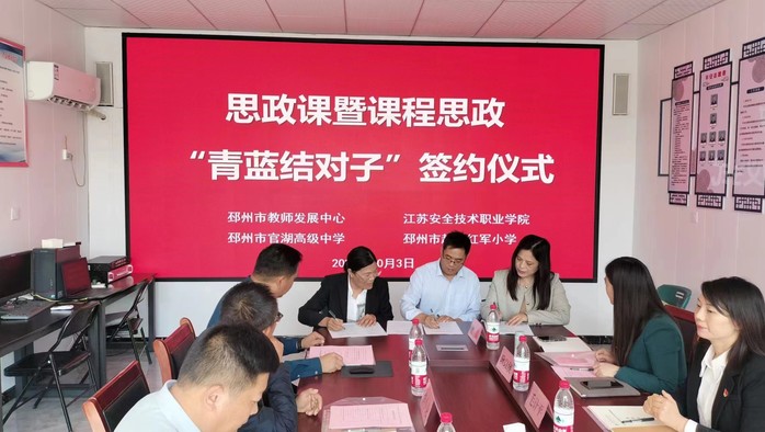 今年6月,邳州市教育局聯(lián)合我院成功立項2023年江蘇省“大中小學思政課一體化示范項目”,為進一步推進該項目建設(shè),邳州市教師發(fā)展中心攜手我院開展“思政課暨課程思政‘青藍結(jié)對子’活動”。本次活動上,江蘇安全技術(shù)職業(yè)學院、邳州市官湖高級中學、邳州市超時紅軍小學簽署“青藍結(jié)對子”協(xié)議,進一步激活了馬克思主義學院服務(wù)地方教育發(fā)展的潛能。活動中還開展了“紅色文化·鑄魂育人”座談交流會和“行走的思政課:江蘇安全技術(shù)職業(yè)學院‘鄉(xiāng)村向日葵書屋’閱讀活動”。