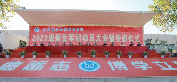 11月6日,學院隆重舉行2023級新生軍訓動員大會暨授旗儀式。學院全體在校院領導出席大會。駐徐某旅副政委杜方昆受邀出席大會。賈汪校區管理辦公室、學工處(武裝部)負責人、各二級學院黨總支書記、承訓教官以及2023級參訓新生參加大會。大會由黨委副書記成伯君主持。