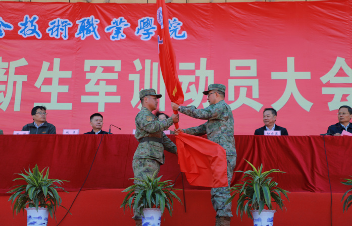 授旗儀式 黨委書記張東良為軍訓團授旗并下達開訓命令 駐徐某旅副政委杜方昆為軍訓營授旗