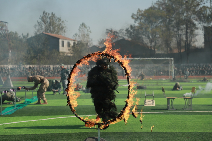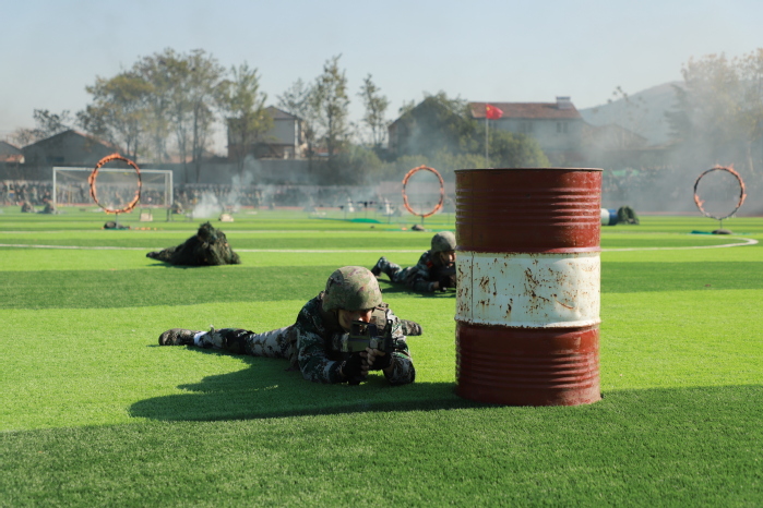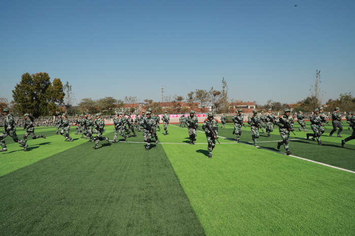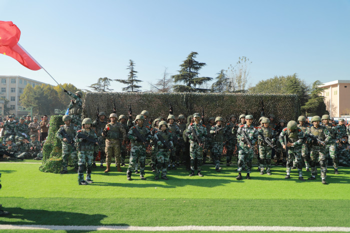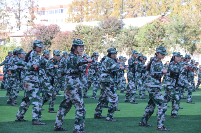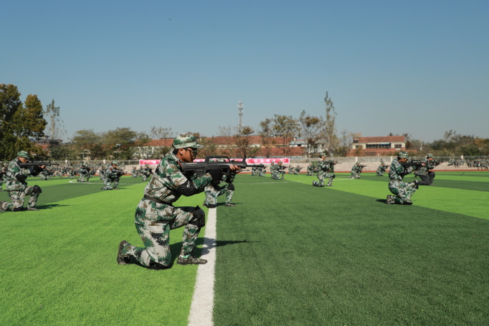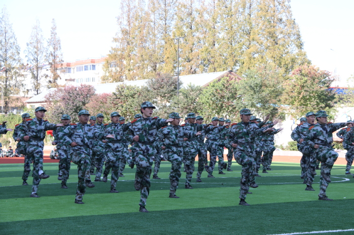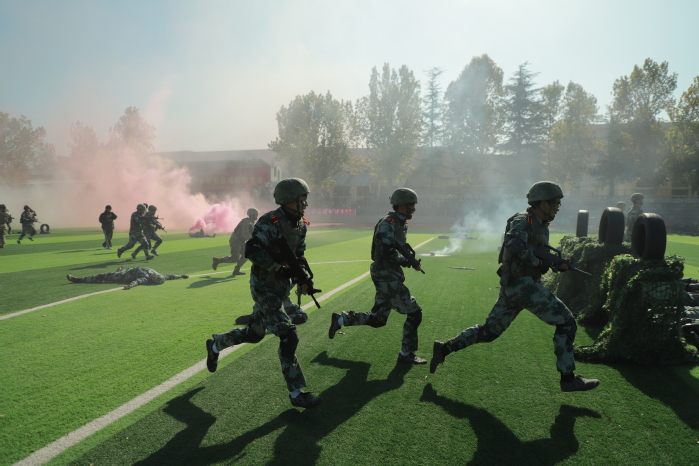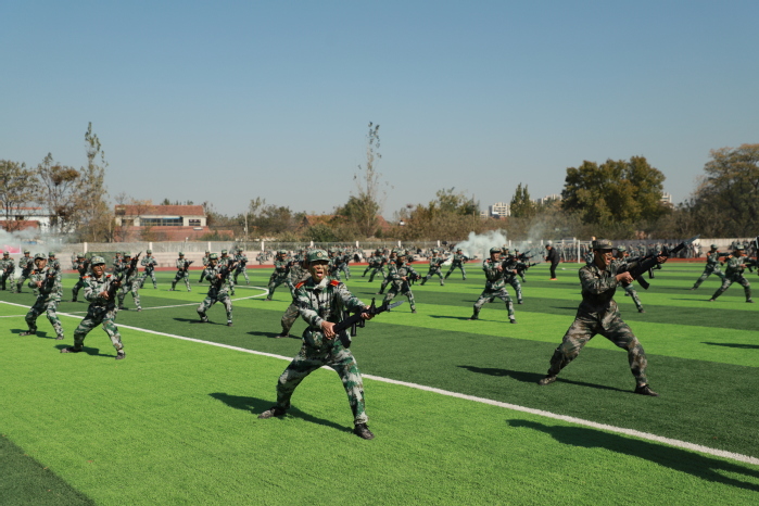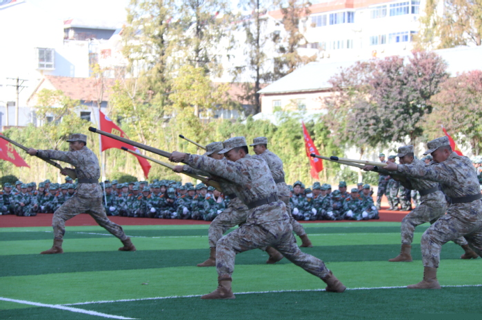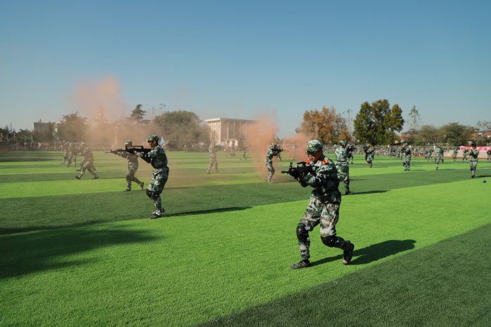 在軍事科目表演環節,“數字”方隊手持雙色扇,進行了動作變換展示;刺殺操方隊動作整齊劃一、協調有序、孔武有力,同學們身手矯健、口號響亮;隊形隊列方隊和教官方隊動作干凈利落,個個精神抖擻、英姿颯爽;戰術科目表演模擬戰爭環境,同學們運用戰術隊形進行作戰演練,接敵運動、搏斗殺敵、奪取陣地,精彩的表演贏得了現場陣陣掌聲和喝彩。
