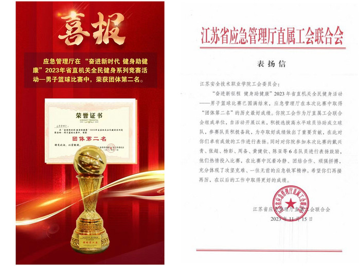 11月11日,2023年江蘇省省直機關全民健身系列競賽活動男子籃球比賽在南京奧體中心落下帷幕。71支省級機關代表隊,852名運動員歷時1個多月,經過144場比賽的激烈角逐順利完賽。我院工會選送的6名男職工代表省應急管理廳組隊參賽,最終以8戰7勝的優異戰績獲得本次比賽的團體第二名,創歷史最好成績,受到省應急管理廳表揚。