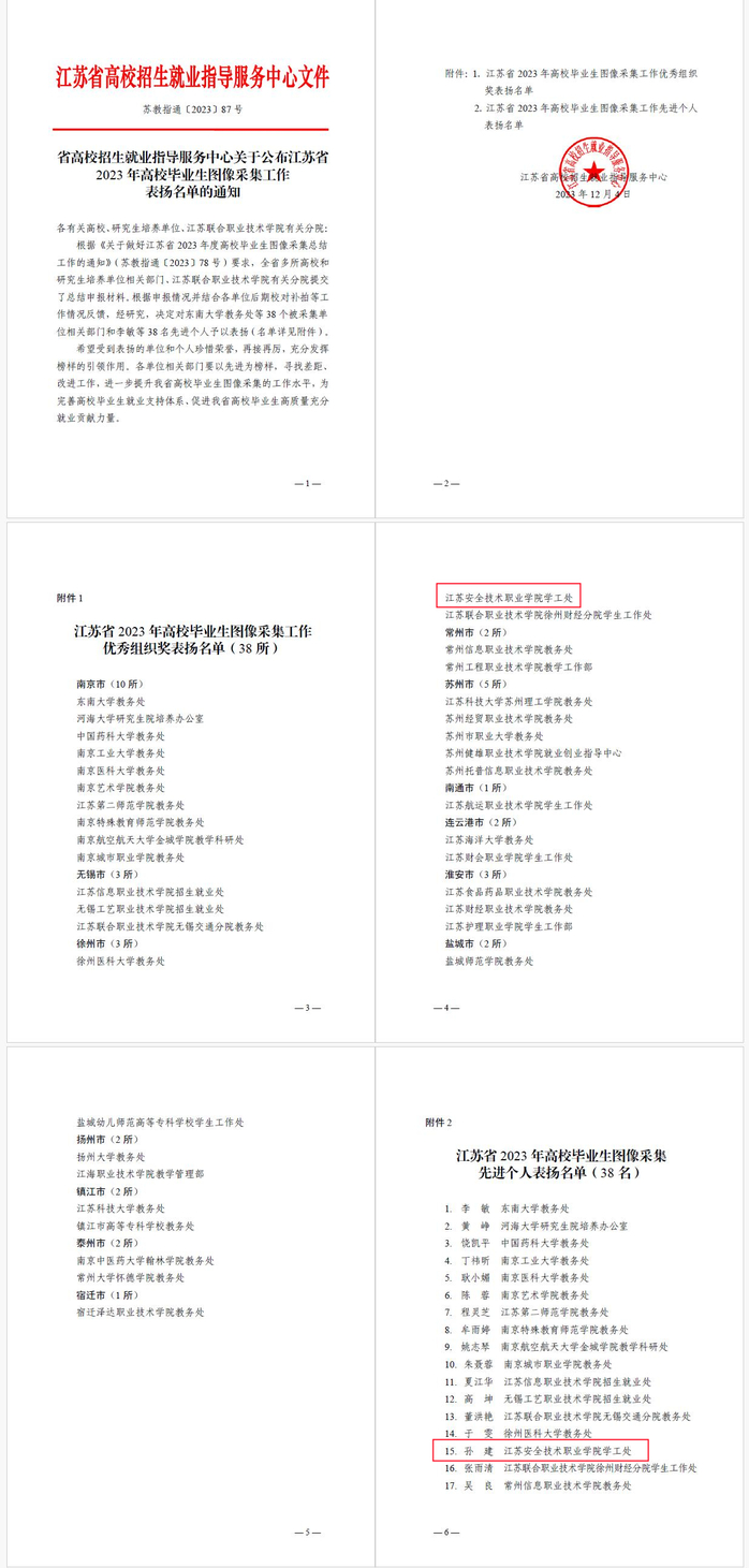 近日,江蘇省高校招生就業(yè)指導服務中心發(fā)布《關于公布江蘇省2023年高校畢業(yè)生圖像采集工作表揚名單的通知》,我院學生工作處榮獲“江蘇省2023年高校畢業(yè)生圖像采集工作優(yōu)秀組織獎”,孫建老師榮獲“先進個人”榮譽稱號。