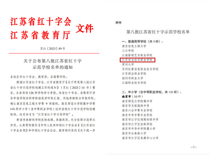 近日,江蘇省紅十字會、江蘇省教育廳聯合公布了第八批江蘇省紅十字示范學校名單,我院從全省參與申報的百余所學校中脫穎而出,榮獲“江蘇省紅十字示范學校”稱號。