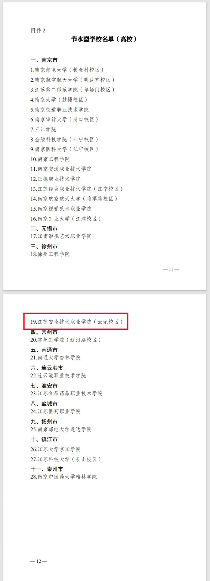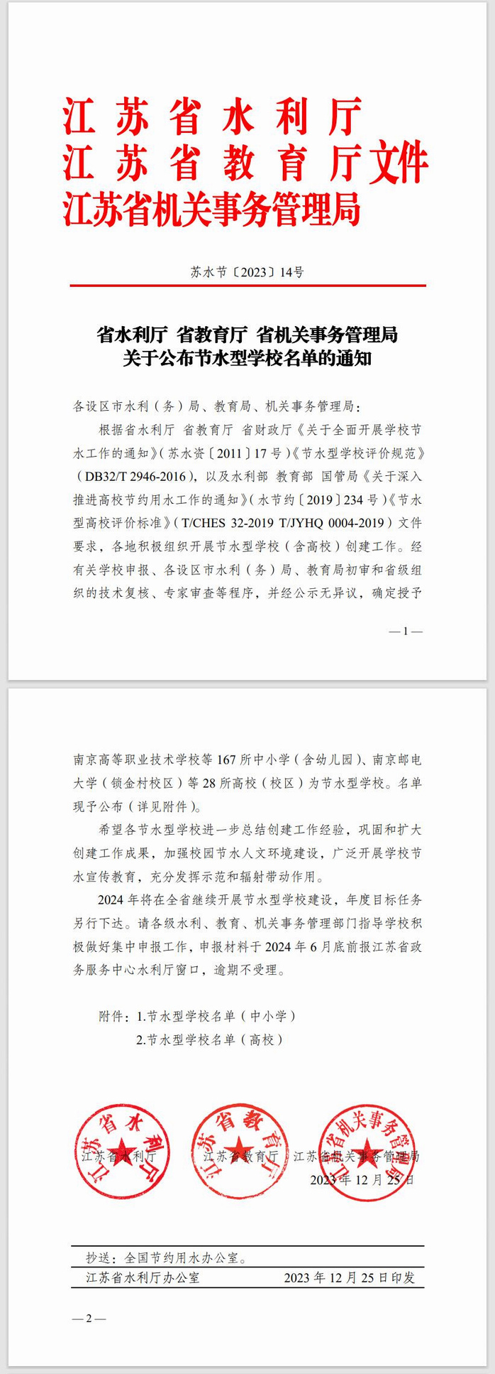 近日,省水利廳 省教育廳 省機關事務管理局《關于公布節水型學校名單的通知》發布,經學院申報,徐州市水利(務)局、教育局初審和省級組織的技術復核、專家審查等程序,經公示無異議,我院確定被授予江蘇省2023年度“節水型高校”榮譽稱號。