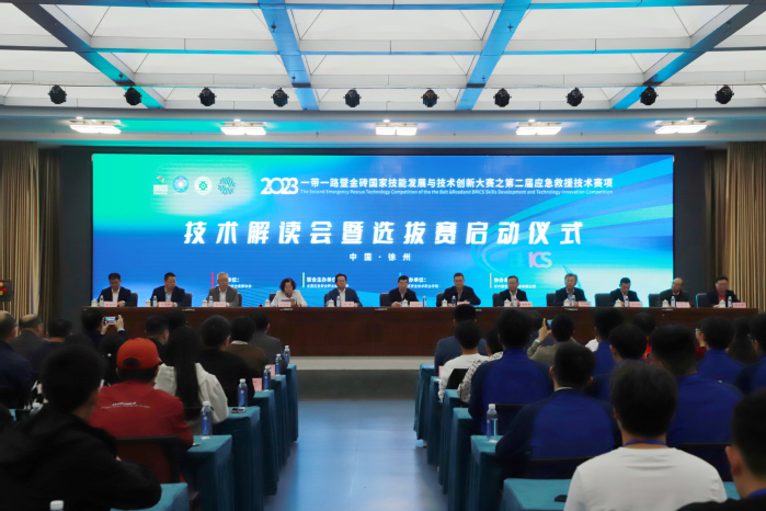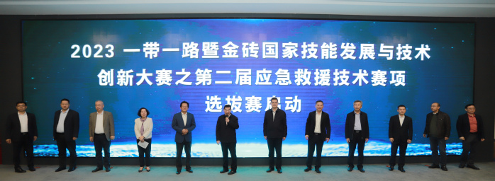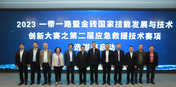 啟動儀式上,與會領導共觸屏幕啟動“2023 一帶一路暨金磚國家技能發(fā)展與技術創(chuàng)新大賽之第二屆應急救援技術賽項選拔賽”。