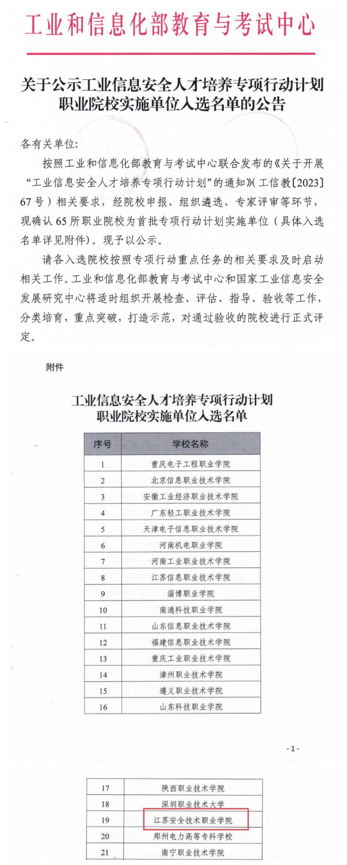 近日,工業(yè)和信息化部教育與考試中心發(fā)布了工業(yè)信息安全人才培養(yǎng)專項行動計劃職業(yè)院校實施單位入選名單,我院入選為該人才培養(yǎng)專項行動計劃的實施單位。