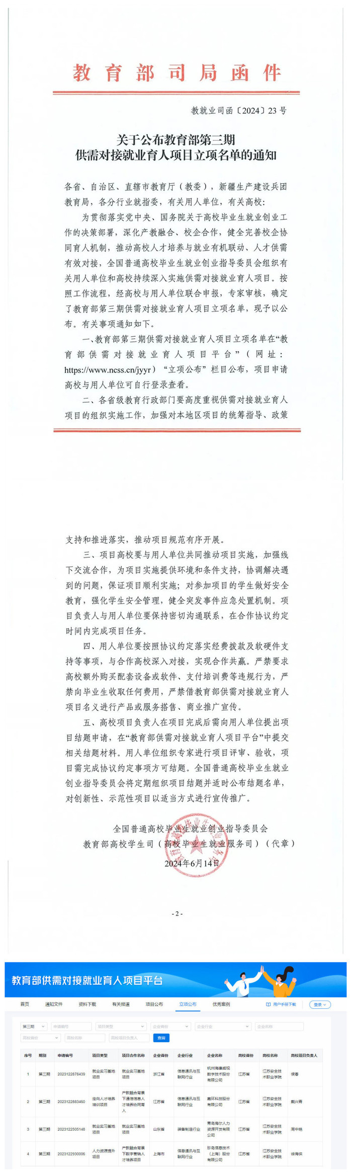 近日,教育部高校學生司公布了第三期供需對接就業育人項目立項名單,我院與相關企業聯合申報的4個項目獲得立項。其中包括智能制造與應急裝備學院與青島海爾人力資源開發有限公司和杭州海康威視數字技術股份有限公司申報的就業實習基地項目2項,網絡與信息安全學院與嘉環科技股份有限公司申報的定向人才培養培訓項目1項,商貿與人文學院與珍島信息技術(上海)股份有限公司申報的人力資源提升項目1項。