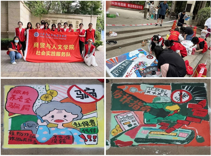 【安全無詐伴你行 彩繪安全助防騙】7月6日至7月10日,商貿與人文學院“安全無詐伴你行”暑期社會實踐團在徐州市云龍區翠屏山街道辦事處云飛社區與和平上東社區,實踐團成員們充分發揮創意與才華,以獨特的彩繪藝術形式,將復雜的防詐騙知識融入生動有趣的彩繪作品中。從社區公告欄到休閑廣場,一幅幅色彩斑斕、寓意深刻的防騙宣傳畫躍然眼前,不僅美化了環境,更讓居民在欣賞藝術的同時,潛移默化地接受了防騙教育。這些作品涵蓋了網絡詐騙、電話詐騙、冒充公檢法詐騙等多種常見騙局,以直觀易懂的方式提醒大家時刻保持警惕。街道辦事處、社區工作人員、小區物業人員紛紛積極參與其中,多方共同努力為構建無詐社區貢獻力量。