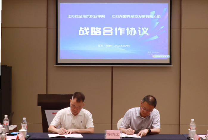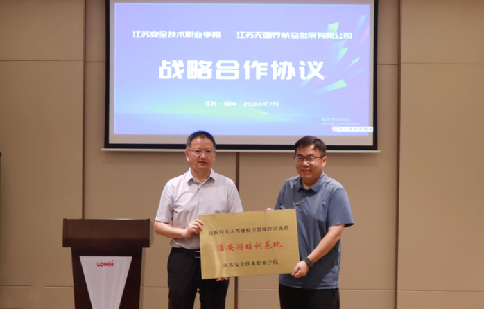 朱偉軍代表學(xué)院同黃飛建簽訂校企合作戰(zhàn)略協(xié)議,并與賈汪區(qū)潘安湖街道辦事處主任朱明虎一同為“潘安湖民航局無(wú)人駕駛航空器操控員執(zhí)照培訓(xùn)基地”揭牌。