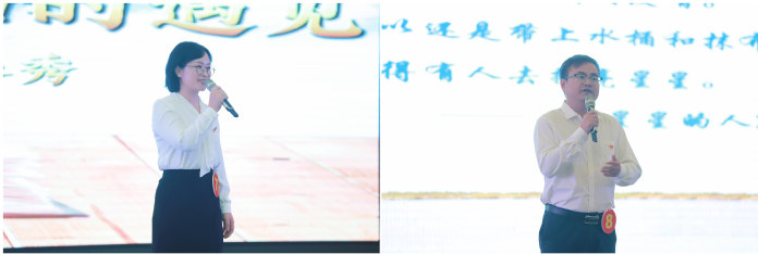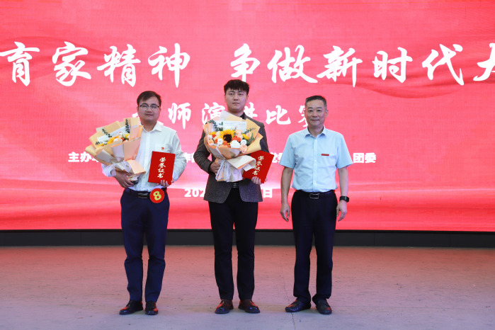 為全面展示我院教師昂揚向上的精神風貌,今年的表彰大會還隆重舉行了“弘揚教育家精神 爭做時代大先生”教師演講比賽。來自各二級單位的10名教師參與角逐,他們緊扣主題,結合自己的親歷、親見、親聞、親為,以真摯的情感、鮮活的事例,講述了自己在平凡的教育崗位上不平凡的經歷,生動詮釋著對教育工作的熱愛。他們以鮮活的案例為引,以真摯的情感為墨,分享了在教育教學一線的所見所聞、所思所感。比賽期間還穿插了我院師生表演的節目《謝謝老師》《致敬人民教師》。最終,比賽評選出一等獎2名、二等獎3名、三等獎5名,張東良現場為獲一等獎教師頒發了榮譽證書并合影留念。