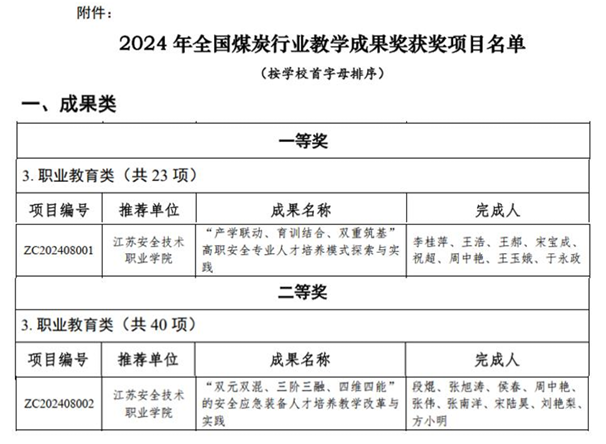 全國煤炭行業教學成果獎每四年開評一次,經資格審查、評審專家組函評、專家委員會現場答辯評審、全國煤炭行業教學成果獎工作領導小組審定,共評選出2024年教學成果獎445項。其中,特等獎50項,一等獎135項,二等獎260項。