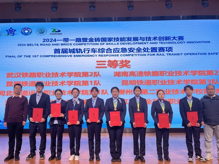 近日,2024“一帶一路”暨金磚國家技能發(fā)展與技術創(chuàng)新大賽之“首屆城軌行車綜合應急安全處置賽項”在武漢鐵路職業(yè)技術學院落下帷幕。經(jīng)過激烈的角逐,汽車與交通安全學院耿子康、金月娥老師指導的王妍、李思雨、姜曉曉、熊曾曉鋒團隊獲得三等獎,王平、胡天慈老師指導的楊涵、張鄭碩、董麗琴、周美琪團隊獲得優(yōu)秀獎。