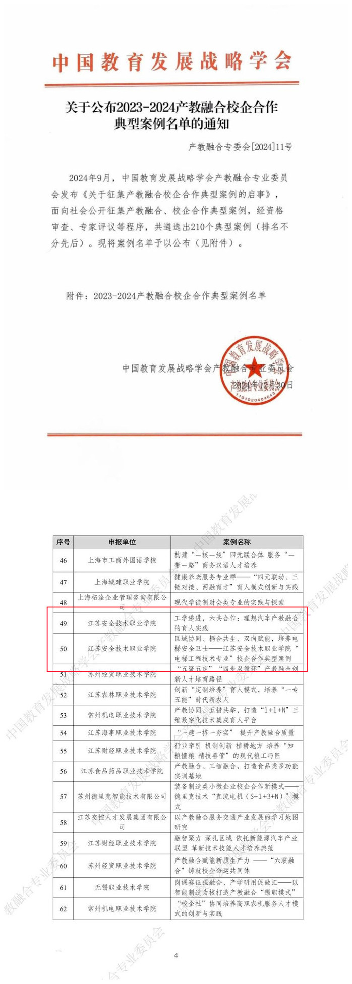 近日,中國(guó)教育發(fā)展戰(zhàn)略學(xué)會(huì)產(chǎn)教融合專(zhuān)業(yè)委員會(huì)發(fā)布了2023—2024產(chǎn)教融合校企合作典型案例。我校推薦的《工學(xué)遞進(jìn),六共合作:理想汽車(chē)產(chǎn)教融合的育人實(shí)踐》《區(qū)域協(xié)同 耦合共生 雙向賦能 培養(yǎng)電梯安全衛(wèi)士——江蘇安全技術(shù)職業(yè)學(xué)院“電梯工程技術(shù)專(zhuān)業(yè)”校企合作典型案例》兩件作品成功入選,也是在徐高職院校中的唯一獲獎(jiǎng)學(xué)校。