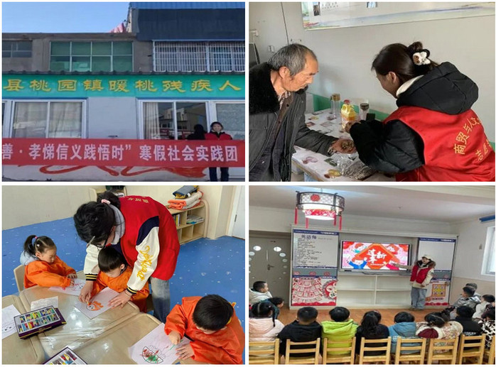 商貿(mào)與人文學(xué)院“崇德尚善?孝悌信義踐悟時”寒假社會實(shí)踐團(tuán)第一站到達(dá)了睢寧縣桃園鎮(zhèn)暖桃殘疾人之家,為老人們帶去了精心準(zhǔn)備的禮物,還為老人打掃衛(wèi)生,掃地、擦桌子、拖地等;實(shí)踐團(tuán)在家鄉(xiāng)社區(qū)開展“悌行鄰里”兒童關(guān)愛活動,現(xiàn)場教孩子們包餃子、繪畫、做手工,在他們心中種下了“悌”的種子;走入商業(yè)街區(qū),開展 “誠信經(jīng)營,從我做起”的宣傳活動;隊(duì)員們還前往當(dāng)?shù)剜l(xiāng)村地區(qū)的幼兒園進(jìn)行支教,開展關(guān)于過年的手工活動和新年課程,幫助幼兒拓寬視野、增長知識。