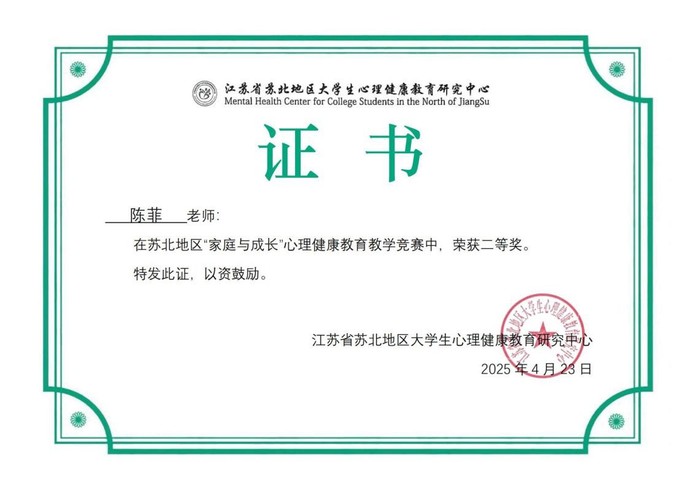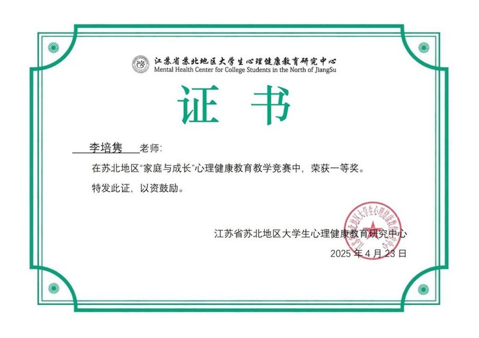 4月27日,從蘇北地區(qū)大學(xué)生心理健康教育研究中心獲悉,我校網(wǎng)絡(luò)與信息安全學(xué)院輔導(dǎo)員李培雋老師和心理健康教育中心陳菲老師在蘇北地區(qū)高校“家庭與成長”心理健康教育教學(xué)競賽中分獲一等獎和二等獎。
