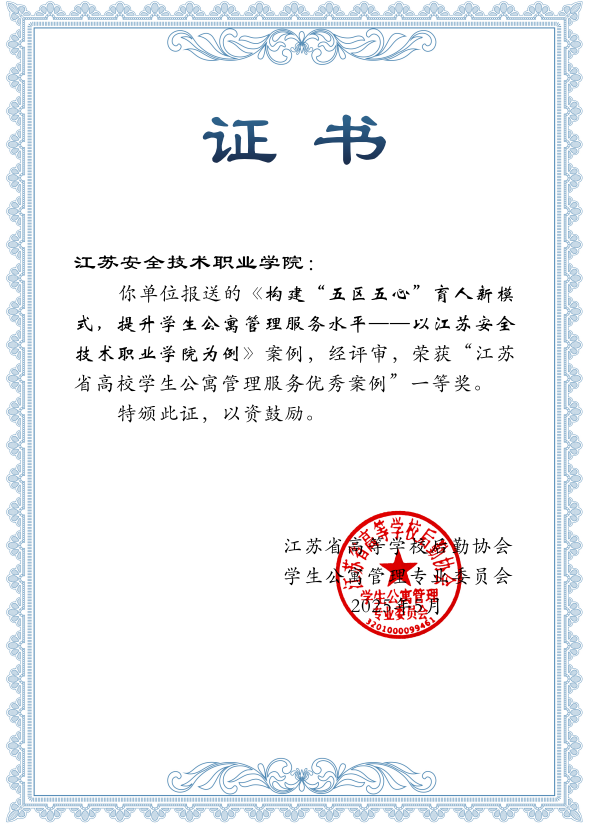 近日,由江蘇省高等學校學生公寓管理專業委員會主辦的“高校學生公寓管理服務優秀案例”征集活動評選結果揭曉,經自主申報、材料審核、專家評審等程序,我校推薦的案例《構建“五區五心”育人新模式,提升學生公寓管理服務水平—以江蘇安全技術職業學院為例》獲評江蘇省高校學生公寓管理服務優秀案例一等獎。