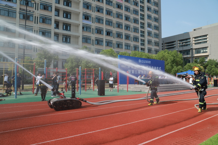 在消防救援風(fēng)采展示環(huán)節(jié),云龍區(qū)消防救援大隊隊員與我校相關(guān)專業(yè)學(xué)生通力合作,精彩呈現(xiàn)了消防疏散物資與機器人偵查滅火操科目演示。在消防疏散物資演練中,消防隊員與同學(xué)們配合默契,以規(guī)范專業(yè)的動作、高效有序的協(xié)作,快速完成模擬障礙物的安全轉(zhuǎn)移,生動展現(xiàn)了科學(xué)處置火災(zāi)風(fēng)險源的標準流程。機器人偵查滅火操則帶來震撼的科技體驗,智能消防機器人靈巧穿梭于模擬火場,依托先進傳感系統(tǒng)精準定位火源,同時,消防隊員帶來的水槍協(xié)同作戰(zhàn)以交替掩護戰(zhàn)術(shù)實現(xiàn)快速控火。這場融合科技與實戰(zhàn)的演示,讓現(xiàn)場師生近距離感受到“智慧消防”的創(chuàng)新力量。