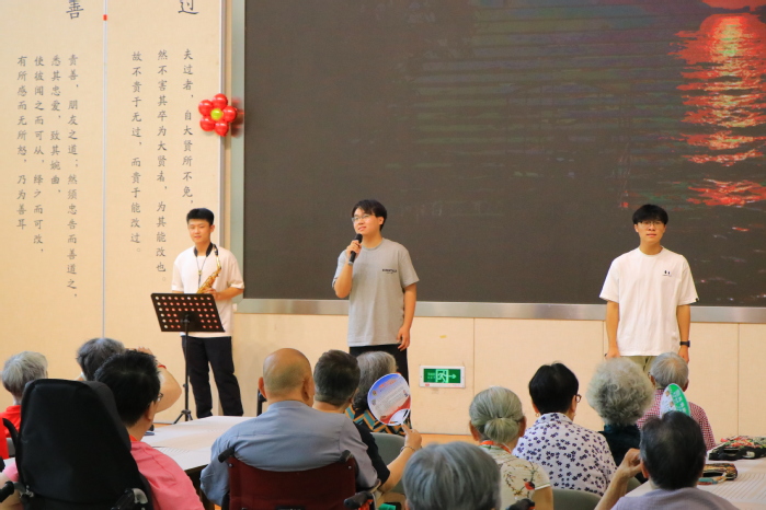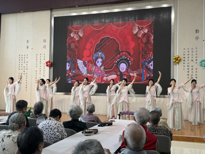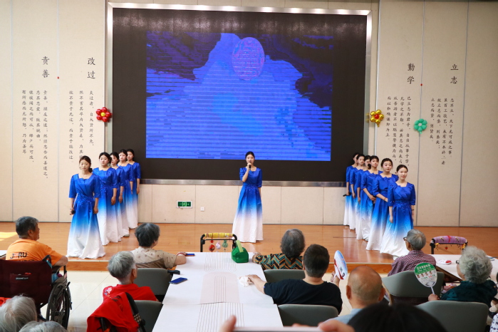 學生代表沈安旭結合自身的勞動經歷,表達了與同學們一道深耕“雙齡互育”項目、促進代際交融的堅定決心。青年學生們通過朗誦《月光下的中國》、演唱《把一切獻給黨》以及表演舞蹈《小城謠》等精彩節目,傳遞出濃濃的家國情懷與蓬勃的青春活力。