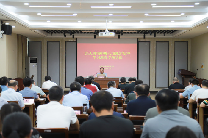 6月27日,學校黨委書記張東良以《深入學習貫徹習近平總書記關于加強黨的作風建設的重要論述,以作風建設新成效激發黨員干部干事創業新作為》為題講授專題黨課。在校院領導、全體中層干部、黨支部書記參加學習。
