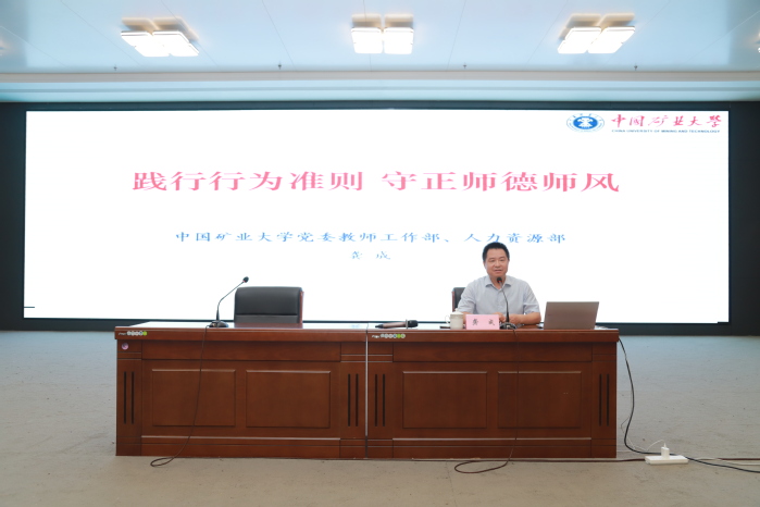 為深入學習貫徹習近平總書記關于教育的重要論述,全面落實教育部關于加強教師思想政治和師德師風建設的工作要求,7月3日,學校邀請中國礦業(yè)大學教師工作部副部長龔成來校作專題輔導報告。校長李桂萍出席并主持活動,全體中層干部、專任教師及輔導員參加培訓。