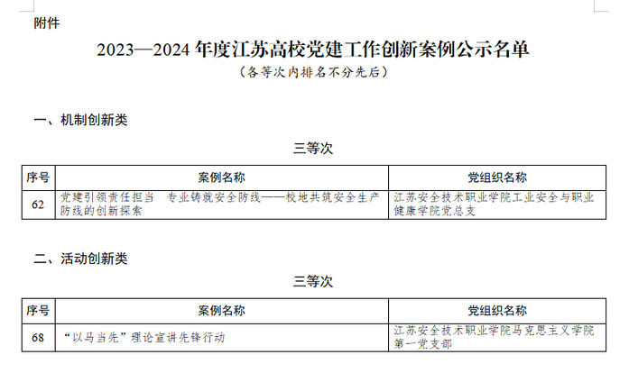 近日,在省委教育工委2023—2024年度江蘇高校黨建工作創新案例評選中,我校2項案例獲獎。其中,《黨建引領責任擔當 專業鑄就安全防線——校地共筑安全生產防線的創新探索》榮獲機制創新類三等次,《“以馬當先”理論宣講先鋒行動》榮獲活動創新類三等次。