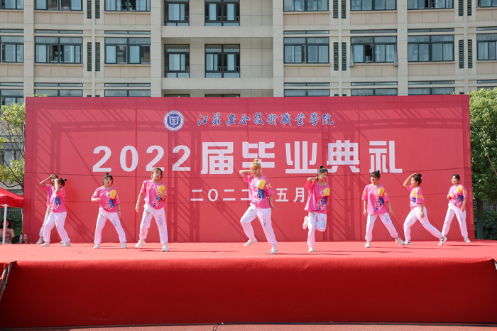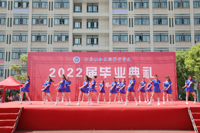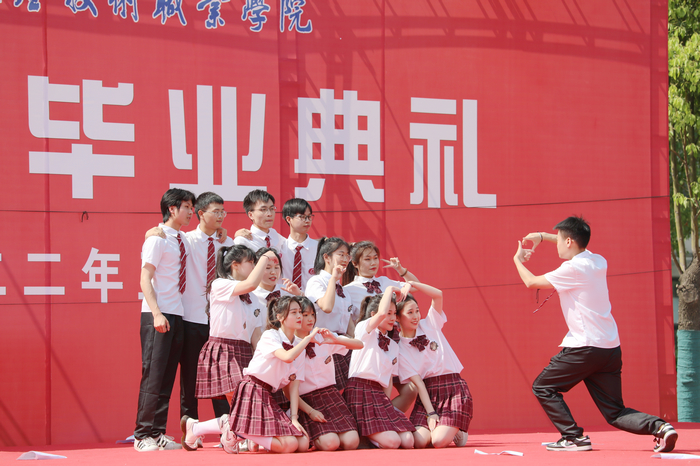 典禮中還穿插了文藝表演。開場舞蹈《Tom boy》展示了我院學(xué)子的滿滿活力。師生朗誦《今天,我們畢業(yè)了》飽含著畢業(yè)生們對校園的眷戀。情景劇舞蹈《同桌的你》讓同學(xué)們一起追憶校園里的青蔥歲月。輔導(dǎo)員小合唱《放心去飛》、女聲獨唱《錦繡前程》,寄托著學(xué)院對2022屆畢業(yè)生的希望。舞蹈《一起向未來》將文藝演出的氣氛推向了高潮。在悠揚的《友誼地久天長》的音樂中,全體與會領(lǐng)導(dǎo)上臺與同學(xué)們合影留念。